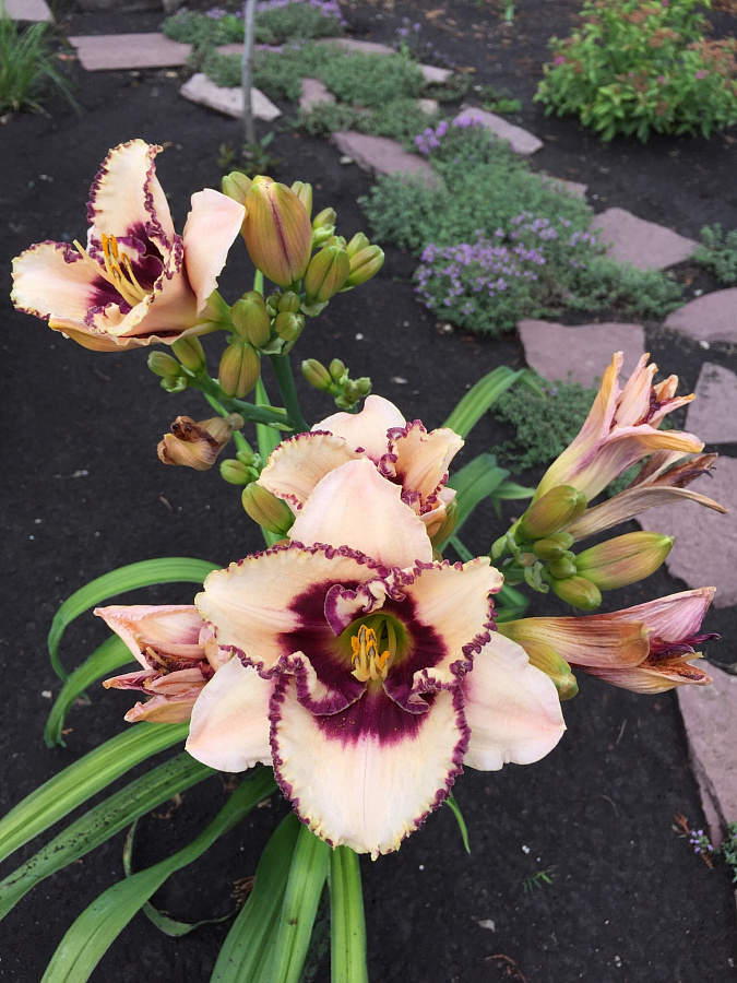 • Окраска цветка : кремовый с темно-сливовым пятном и выразительной каймой, горло зеленое