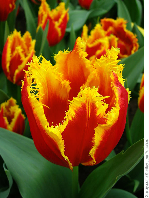 Тюльпан бахромчатый палмарес - это великолепное растение с красивыми красно-желтыми цветками, которые будут радовать ваш взгляд в мае и апреле. Сорт palmares отличается высотой до 45 см и предпочитает солнечные места для посадки. Этот тюльпан идеально подойдет как для групповых, так и для одиночных посадок, добавляя яркие краски в ваш сад.
